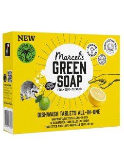 Marcel's Green Soap alles-in-één vaatwastabletten zitten bomvol natuurlijke ingrediënten, zijn 100% plasticvrij, palmolievrij en vegan. Zoals alle producten van Marcel’s Green Soap, bevatten onze vaatwastabletten geen kleurstoffen, parabenen, fosfaten, chloor, ammonia of zuren. Sterker nog, ze zitten bomvol natuurlijke ingrediënten en zijn minstens 97% biologisch afbreekbaar! De vaatwastabletten zijn verpakt in een oplosbare folie. Op deze manier hoef je niet met je natte handen op zoek naar een schaar om het plastic eraf te halen, en besparen we ook weer een hoop plastic. De folie is gemaakt van maïszetmeel en lost op tijdens het wassen. Je hoeft je dus niet druk te maken over plastic dat achterblijft in de machine of het riool.